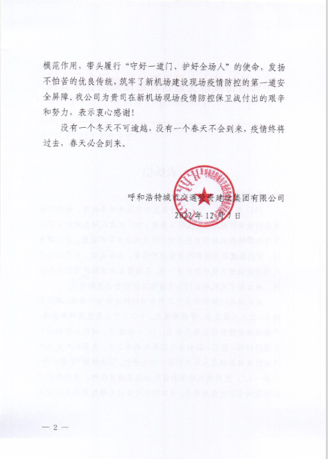 2022年12月7日,呼和浩特市交通投資建設集團有限公司給我司發來表揚信,表揚信中充分肯定了我司呼和浩特新機場項目部在疫情防控工作上作出的努力,展現了我司的社會責任與擔當。